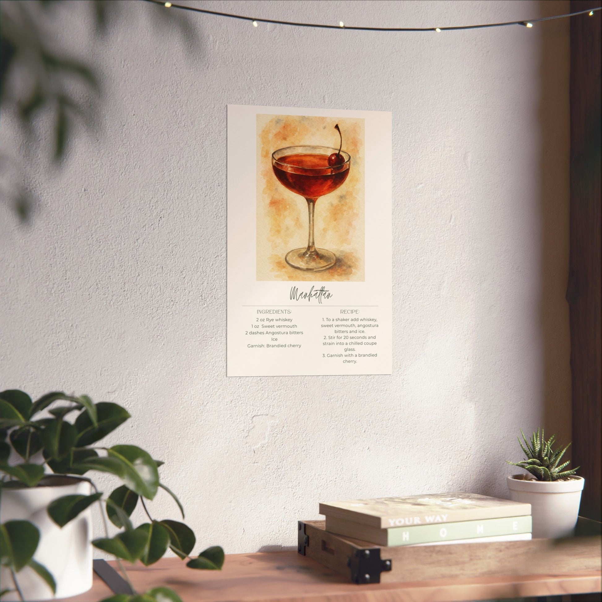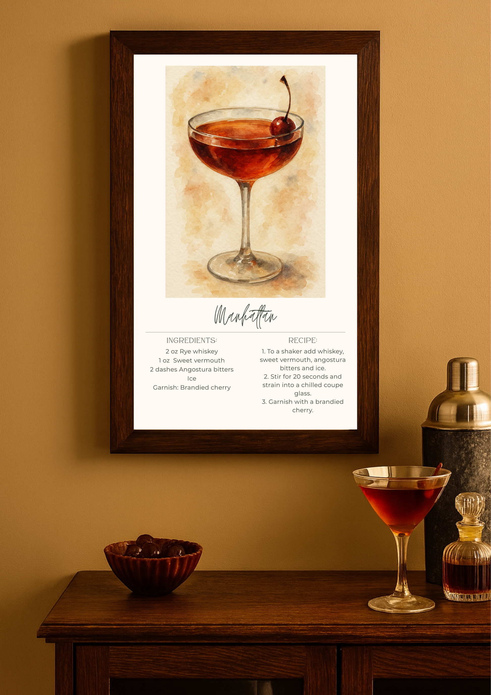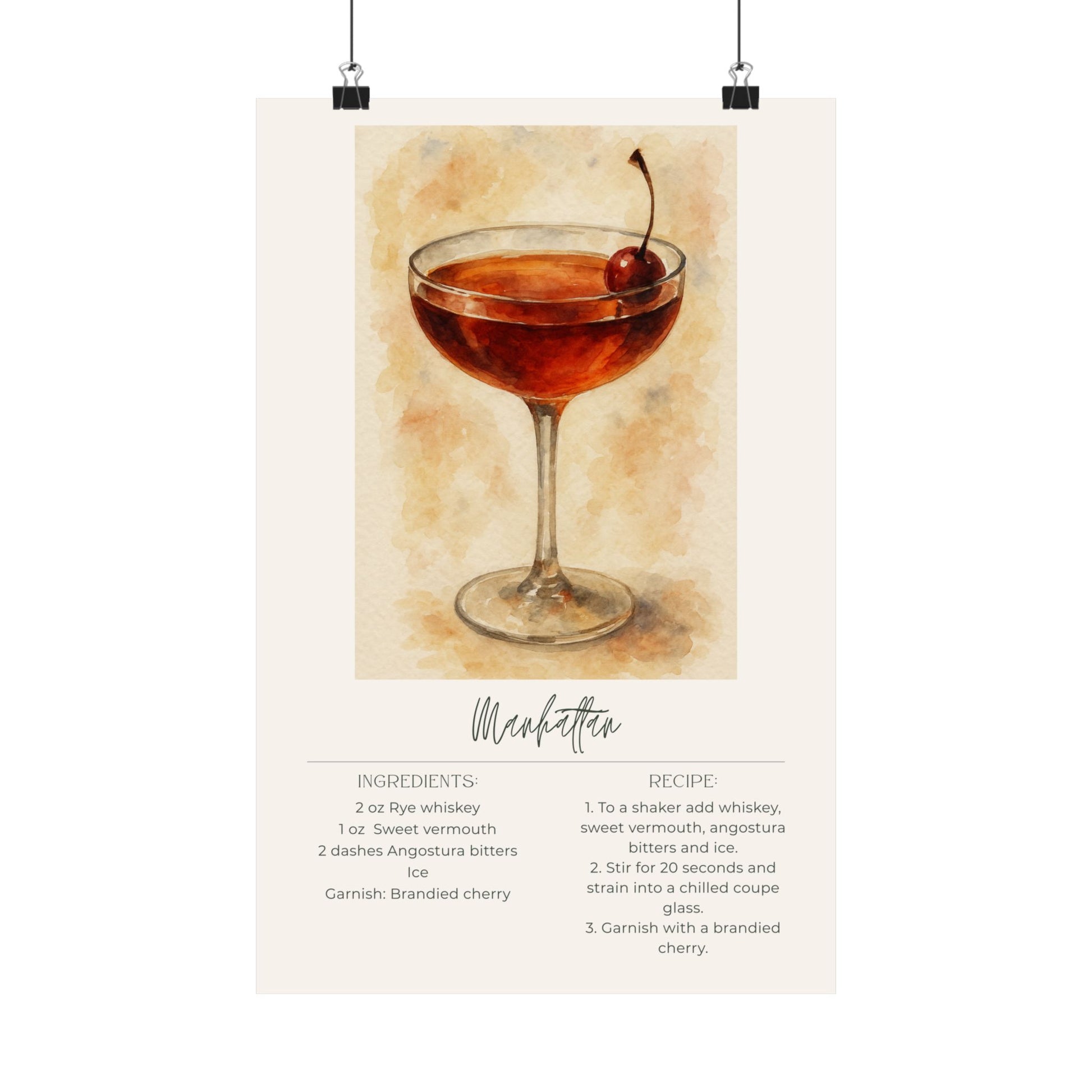 Bring timeless, sophisticated cocktail vibes into your home with this minimalist Manhattan recipe poster. Featuring rich whiskey tones and sleek watercolor details, it’s perfect for your bar cart, kitchen wall, or home cocktail corner. A stylish, elegant piece for anyone who loves classic cocktails and refined decor.