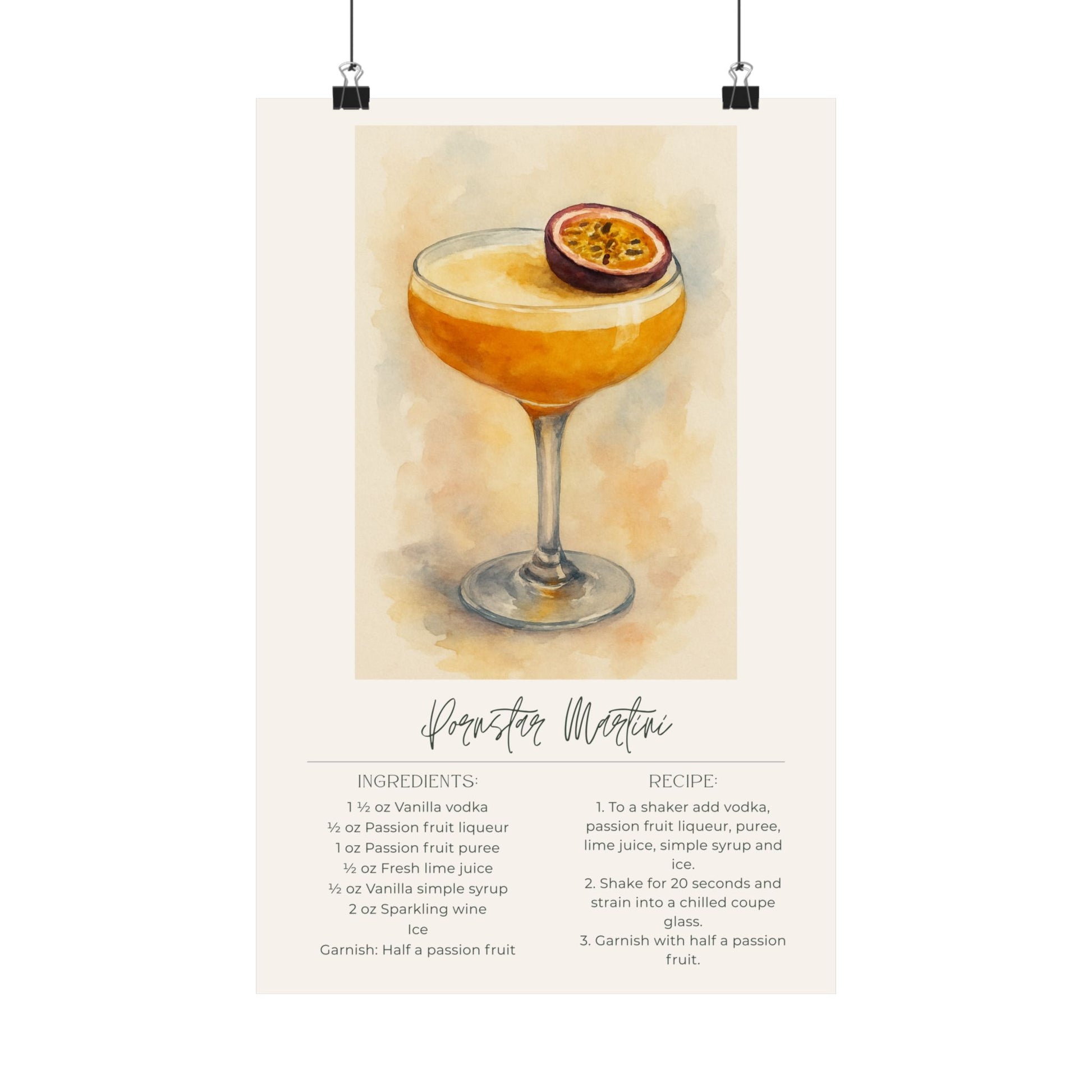 Add fun, glamorous cocktail vibes to your home with this minimalist Pornstar Martini recipe poster. Featuring soft fruity tones and a clean, modern design, it’s perfect for your bar cart, kitchen wall, or home entertaining space. A stylish, playful piece for anyone who loves iconic cocktails and chic decor.